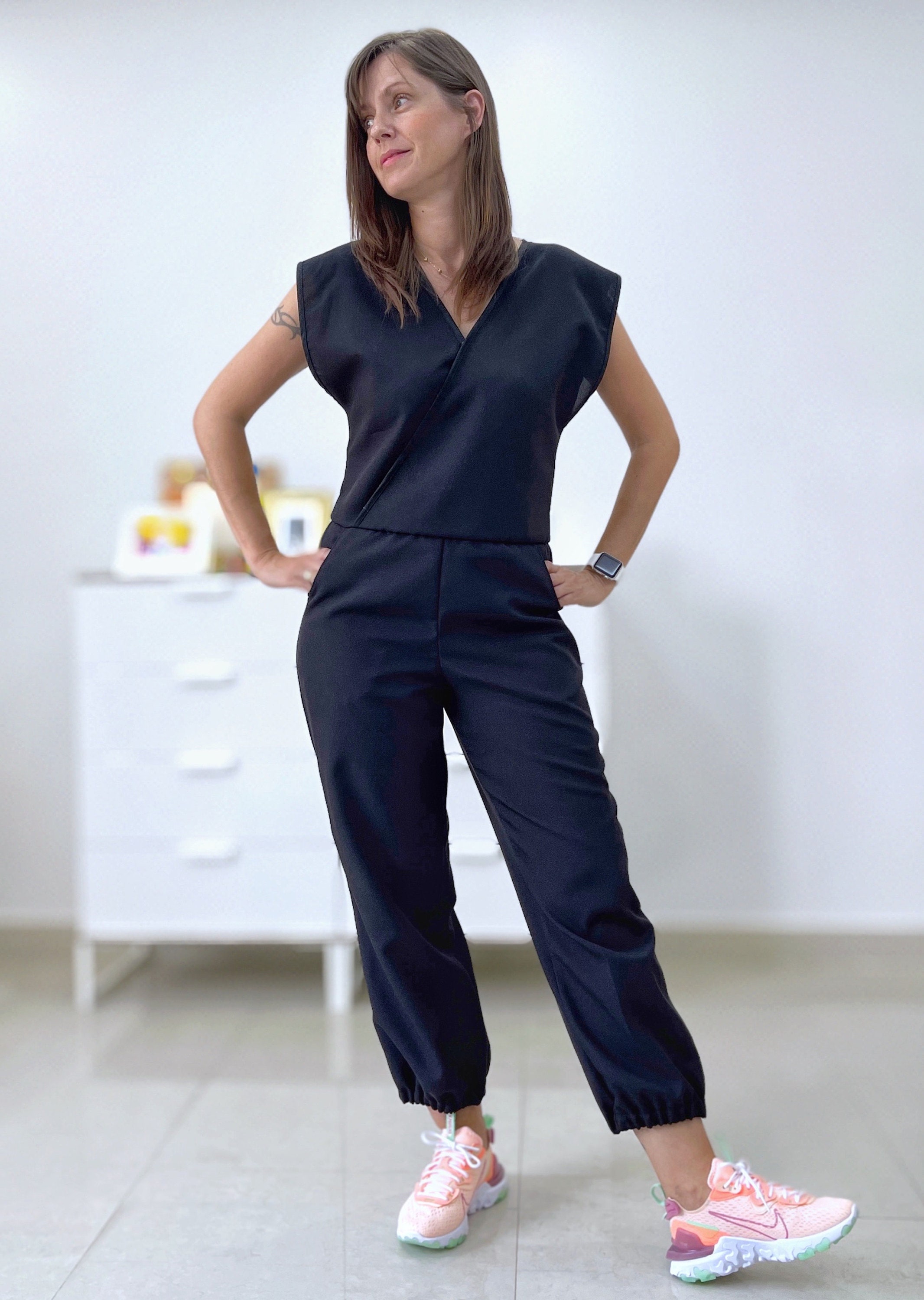 This jumpsuit pattern comes with many possibilities to create your very own and unique jumpsuit. You can choose between two different leg lengths and hem versions; you can make it with short or long sleeves or completely sleeveless, including various terminations. You have the option to add front pockets, an elastic waistline, a drawstring tunnel, and many more.