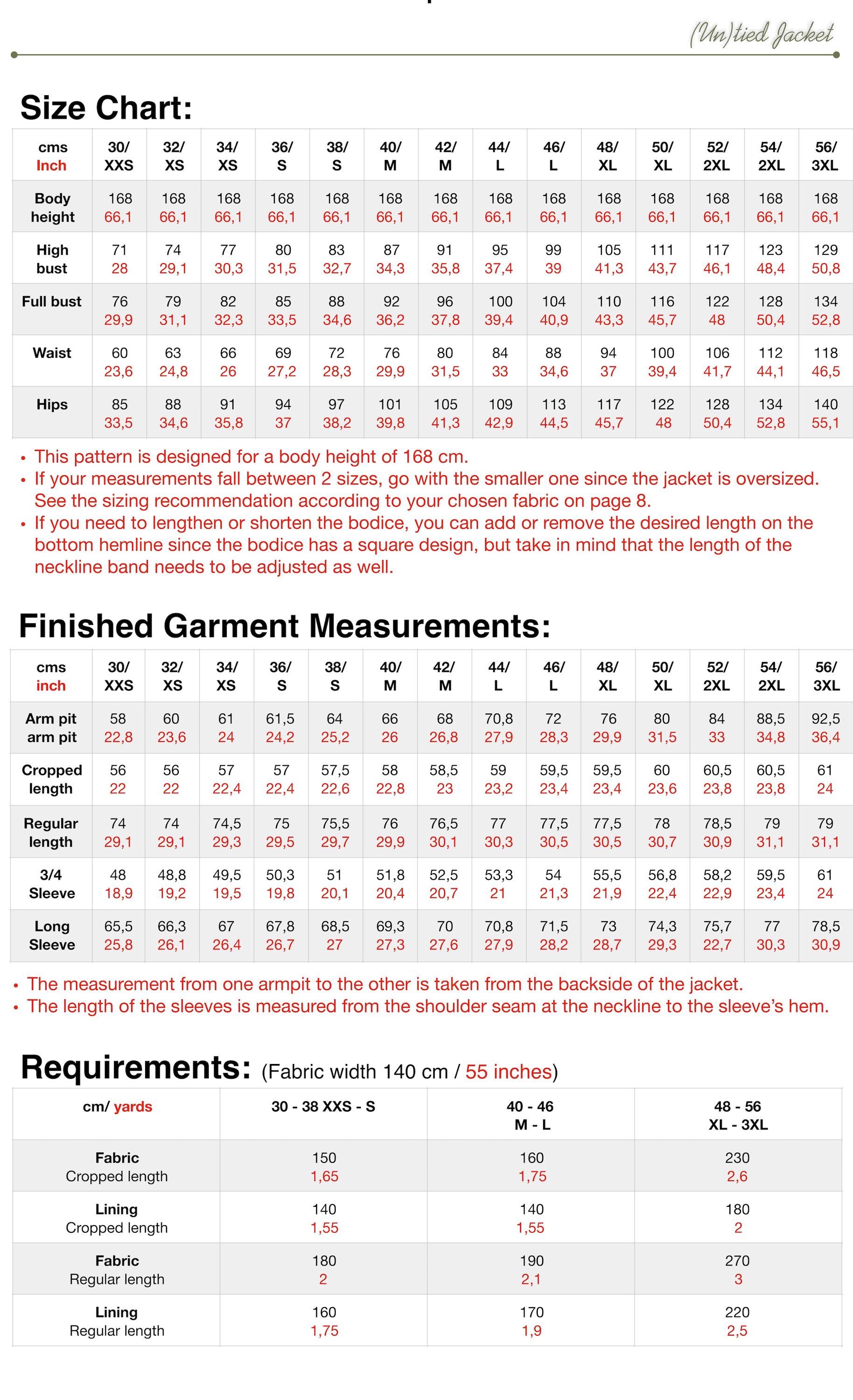 There are plenty of options available in the pattern feature. You can select from two body lengths - cropped and regular, as well as two sleeve lengths - 3/4 and traditional. You can also choose from different widths and ends of neckline bands. Additionally, you can sew the jacket with or without lining, choose from various pocket options, and tie loops are available if you want to wear the jacket closed.